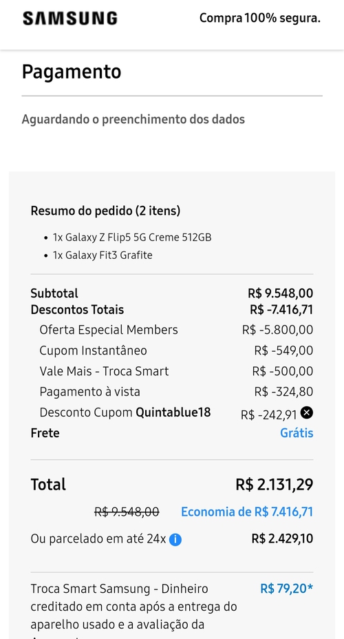 Vá até o SAMSUNG MEMBERS, entrem na opção ofertas e cupom, escolha o Zflip5, usem o troca smart, ganhando 500R$, com qualquer celular adiconado, em seguida avance o procedimento de compra, você ganhará o bônus pra pegar o Galaxy Fit3, você adiciona o bônus e na página de pagamento acrescenta o cupom QUINTABLUE18.
