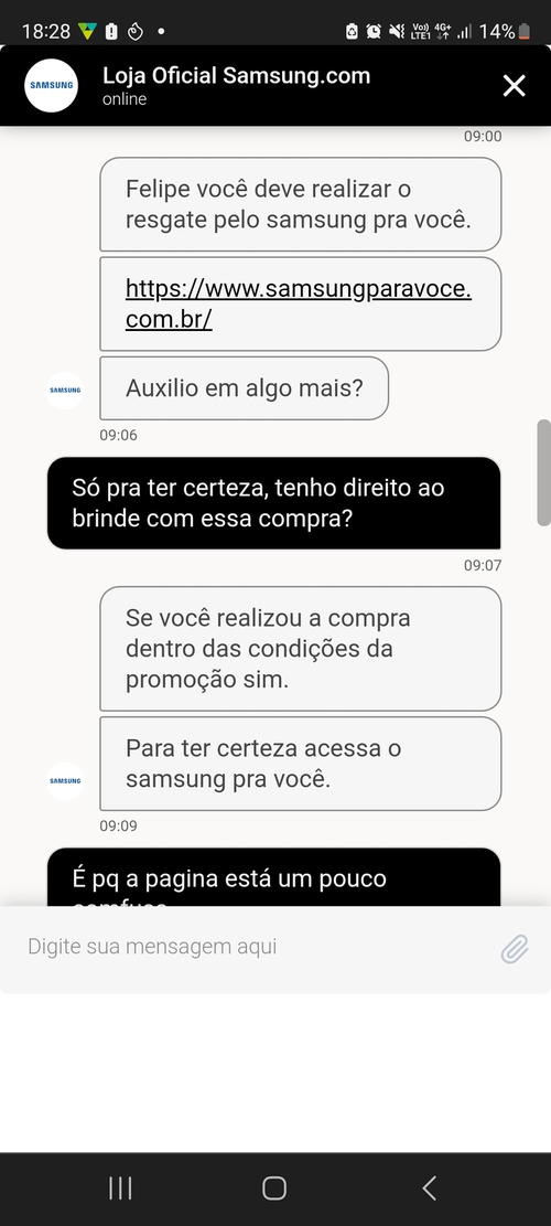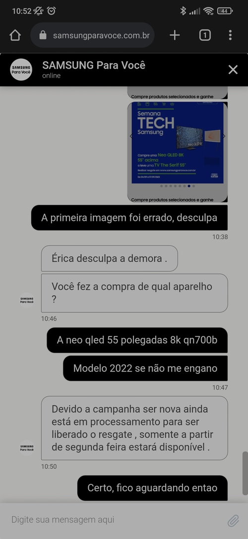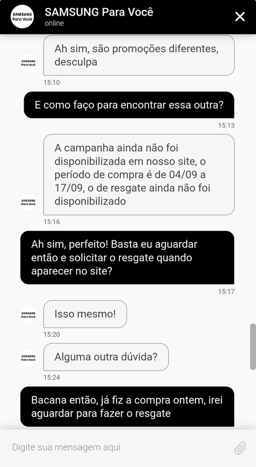 Mandei mensagem no chat do Samsung para voce, demoraram 4 horas para me responder, um absurdo!! E não resolveram nada só relataram que o prazo para análise do resgate agora é de 4 dias úteis, antes tinham determinado 24hrs, estão enrolando na cara dura, péssima experiência.
