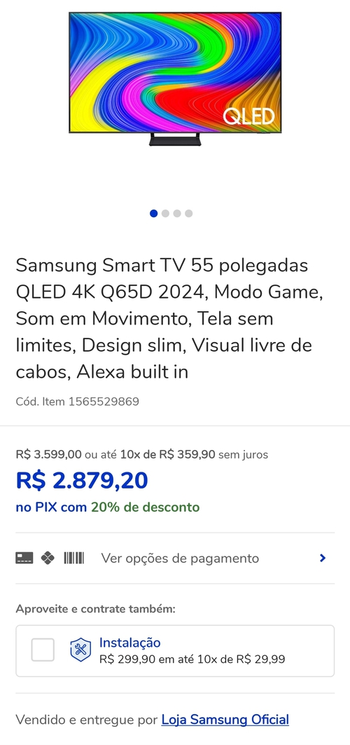 Samsung Smart TV 55 polegadas QLED 4K Q65D 2024, Modo Game, Som em Movimento, Tela sem limites, Design slim, Visual livre de cabos, Alexa built in