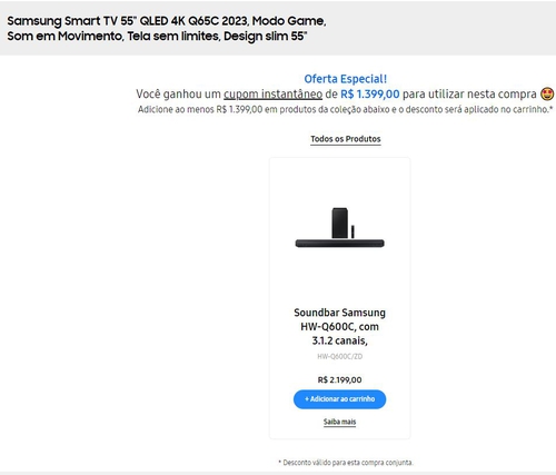 No carrinho ganhe cupom de R$1.399 em uma Soundbar que custa R$2.199