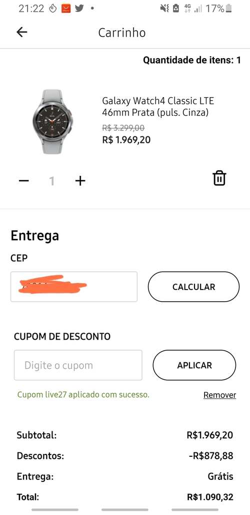1090,32 o Classic LTE de 46mm, mas quando fui pagar no pix saiu por 1309. Quando chegar vou abrir uma reclamação e pegar a diferença ou vou no Procon. Usei o cupom da Live27 de hojeO meu active2 morreu por conta do suor do braço, do nada começou a bugar e morreu oxidou, o mesmo tinha proteção contra água, da um pouco de receio pegar outro Samsung depois disso.