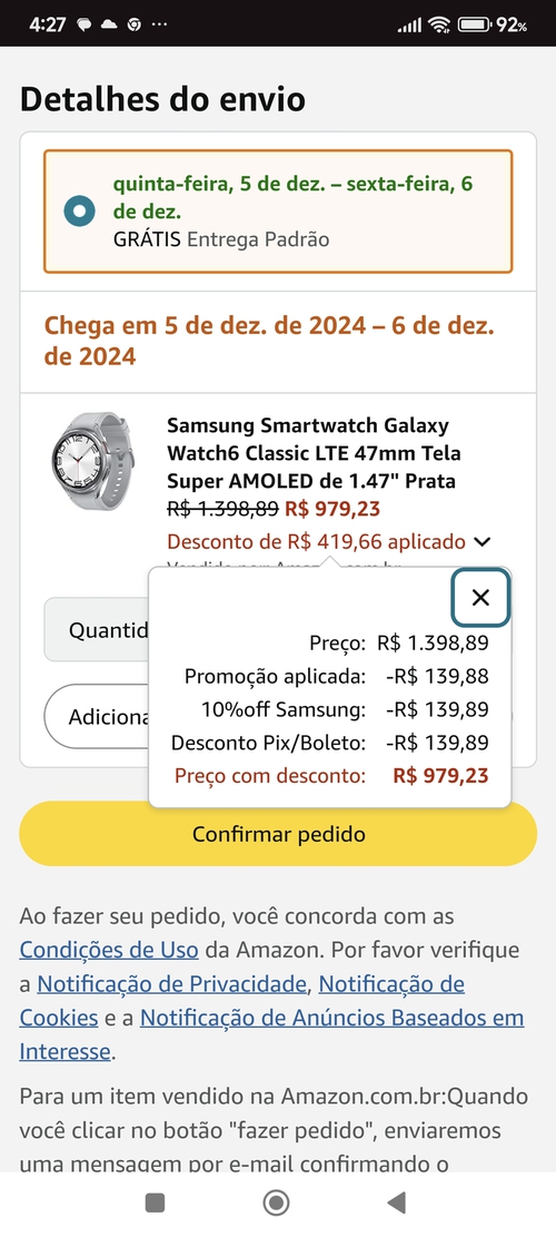 Consegui! Criei uma nova conta na Amazon, inseri os dados, inseri o cupom de desconto, SAMSUNG10, e comprei pelo pix. Deu esse valor da postagem aí.
