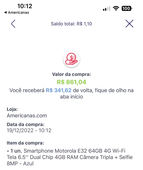Saiu por R$447,51 é só usar o saldo que recebe mais cashback.