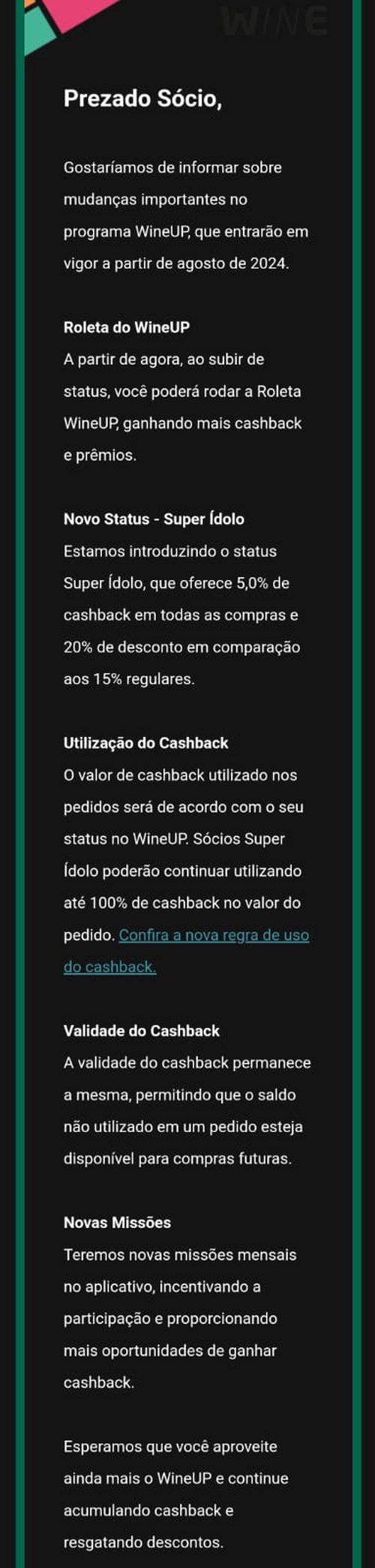 Na minha conta principal liberaram a roleta hoje, mas nas demais não. A princípio estão liberando a roleta pra quem tem status Ídolo no app ou pra quem faz compras recorrentes na loja, ou seja, selecionados. Maaaaaaas falei com o time da Wine e recebi isso aqui: