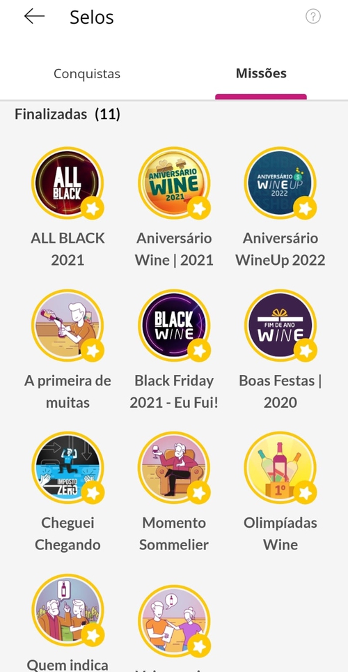 As outras são de uvas específicas, ao comprar vinhos da Melot, bate a missão e também ganha cash. As demais são de campanhas específicas como Black Friday, Aniversário da Wine, Eventos Mundiais ( Copa / Olimpíadas ) primeira compra e por aí vai