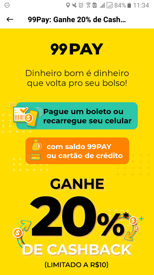 *o bônus de 20% é limitado a R$10 e válido para usuários selecionados. Restrito a um único pagamento de boleto ou recarga de celular, realizada via saldo 99Pay ou Cartão de crédito, efetivada de 13/09/2021 a 19/09/2021 às 23h59 (boletos agendados e pagamento efetuado depois deste período não serão elegíveis). O bônus estará disponível em até 2 horas em seu saldo da 99Pay após a efetivação do pagamento. Restrito a uma única participação por usuário, aparelho telefônico e cartão de crédito cadastrado. O bônus não é válido para pagamentos de boleto gerados através da 99Pay, emitido pela Empresa Parceira, conforme definido nos Termos e Condições de Uso de Conta de Pagamento Pré-Paga – 99Pay. A Recompensa somente poderá ser utilizada nos serviços oferecidos pela 99, recarga de celulares e pagamento de boletos. Não será possível utilizar a Recompensa para o pagamento de boletos emitidos por instituições de pagamento e/ou instituições financeiras e/ou transferência para contas bancárias, contas de pagamento pré-pagas ou pós-pagas, seja de sua titularidade ou da titularidade de terceiros. Promoção válida para usuários selecionados em Alfenas, Alto Capibaribe, Anapolis, Apucarana, Aracaju, Aracatuba, Arapiraca, Ararangua, Assai, Assis, Bacia De Sao Joao, Baixo Cotinguiba, Barbacena, Barra Do Pirai, Barretos, Bauru, Belém, Belo Horizonte, Brasília, Campinas, Campos De Lages, Campos Do Jordao, Campos Dos Goytacazes, Caraguatatuba, Cascavel-Pr, Castanhal, Catanduva, Catu, Caxias, Chapeco, Conselheiro Lafaiete, Criciuma, Cuiabá, Curitiba, Divinopolis, Entorno De Brasilia, Estancia, Feira De Santana, Florianópolis, Fortaleza, Franca, Goiânia, Guarapari, Guarapuava, Guaratingueta, Ilheus-Itabuna, Imperatriz, Itajai, Itamaraca, Itanhaem, Itapetininga, Ituporanga, Ituverava, Jaboticabal, Jau, João Pessoa, Joinville, Limeira, Linhares, Litoral Lagunar, Litoral Nordeste, Litoral Sul-Rn, Londrina, Macae, Macaiba, Macapa, Maceió, Manaus, Maraba, Marilia, Maringá, Montenegro, Montes Claros, Mossoro, Natal, Nova Friburgo, Osorio, Ouro Preto, Palmas-Pr, Palmas-To, Paranagua, Parauapebas, Passo Fundo, Petrolina, Piracicaba, Pocos De Caldas, Ponta Grossa, Porto Alegre, Porto Seguro, Porto Velho, Presidente Prudente, Recife, Rio Branco, Rio De Janeiro, Rio Do Sul, Rondonopolis, Salvador, Santa Cruz Do Sul, Santarem, Santos, Sao Bento Do Sul, Sao Carlos, Sao Joao Da Boa Vista, Sao Jose Do Rio Preto, São José Dos Campos, São Luís, Serrana, Suape, Tabuleiro, Tatui, Teofilo Otoni, Teresina, Tijucas, Toledo, Tres Rios, Uberlândia, Valenca, Vassouras, Vitória.
