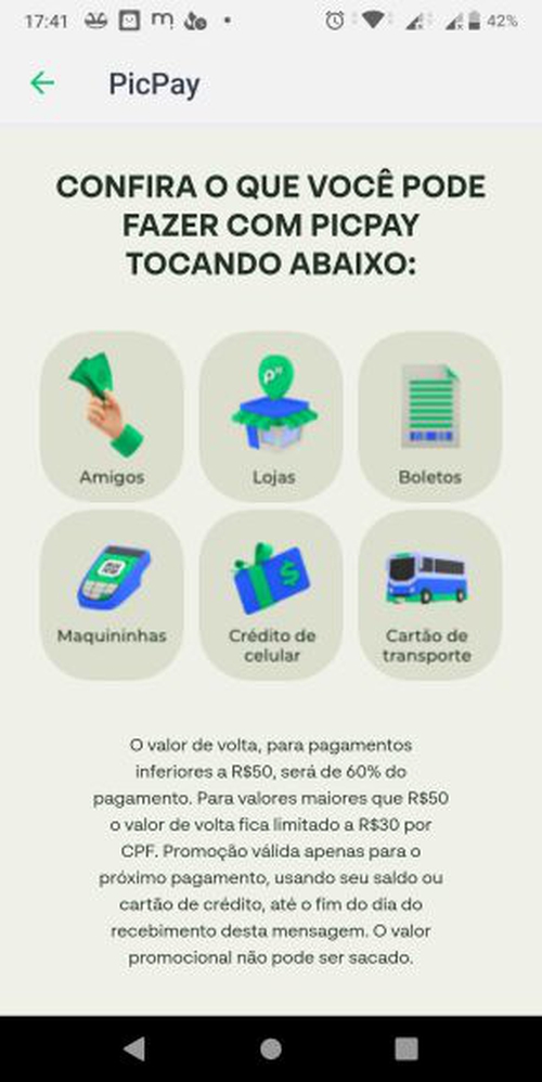SELECIONADOS. 60% de cash limitado a R$30. Pelo saldo em conta ou CC.