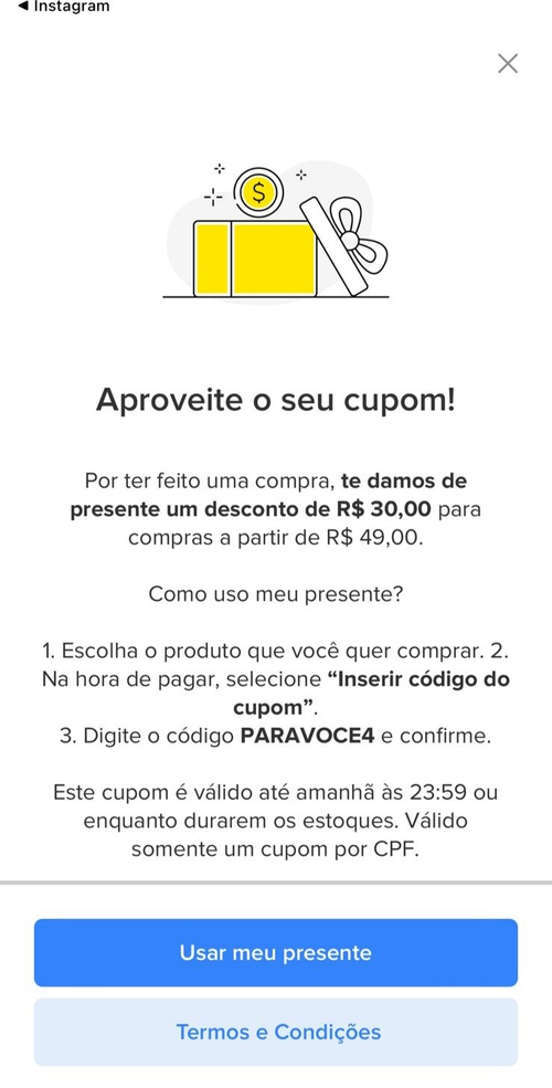 Recebi essa notificação e o cupom funcionou! Pode ser que funcione para mais alguém, vale tentar.Obs: recebi ontem, mas não tive tempo de postar aqui e acabei esquecendo, então pra quem funcionar, teoricamente é válido até hoje!