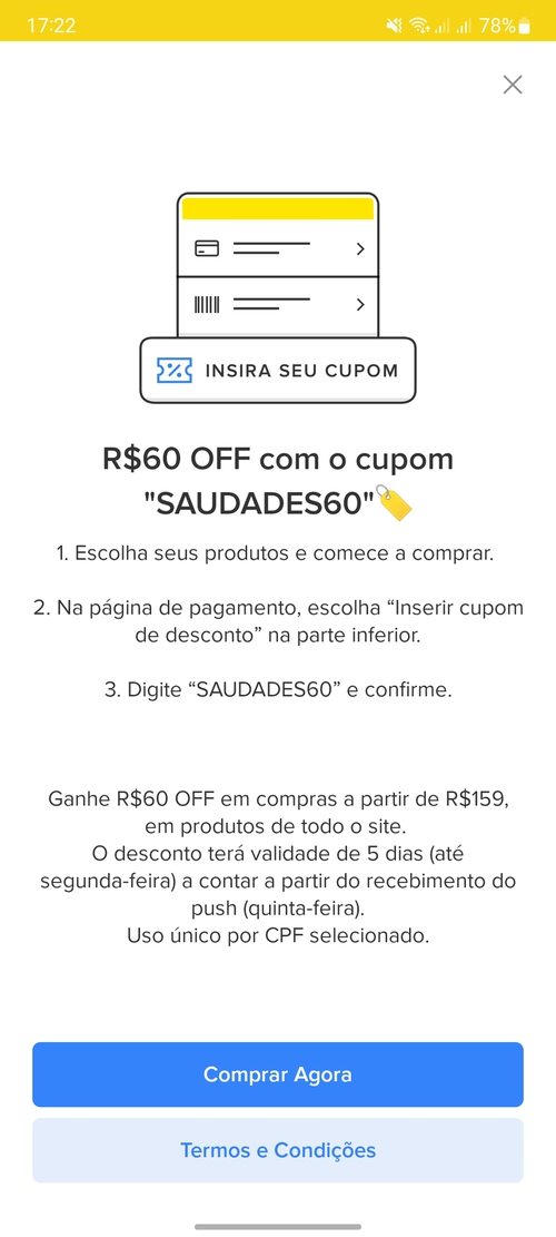 Esses cupons de saudades é pra quem não compra há algum tempo!