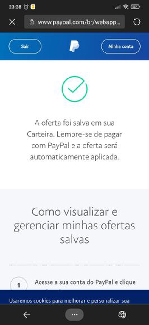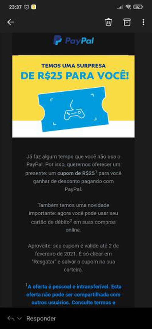Termos e Condições:1Esta oferta concede a titulares de contas do PayPal aptos o direito de receber um desconto de R$25 em uma compra elegível paga com PayPal e é válida somente para titulares de contas do PayPal Brasil que receberam do PayPal o e-mail correspondente a esta promoção. O cupom é válido por 10 dias contados do recebimento deste e-mail, conforme a data apresentada acima que também pode ser consultada acessando a sua conta PayPal na opção "carteira". Não é permitido transferir ou trocar a oferta por dinheiro ou outros descontos, produtos ou serviços. Cada titular de conta do PayPal que recebeu o e-mail correspondente a esta promoção poderá receber o benefício da oferta somente uma vez durante o Período da Oferta. A oferta é pessoal e intransferível e não pode ser compartilhada com outros usuários. Para receber o benefício, é preciso pagar a respectiva compra usando o PayPal. A oferta só é válida para vendedores brasileiros que aceitem pagamentos em Reais, exceto Netshoes, Zattini, Dell, Wine, Davinno e Angeloni ou algumas outras lojas e apps e pode não estar disponível em algumas outras lojas e apps e o desconto não é válido para compras parceladas. O PayPal reserva os direitos de cancelar a oferta e / ou alterar qualquer parte dela ou dos Termos e Condições da oferta a qualquer tempo, sem aviso prévio. As decisões do PayPal sobre todas as matérias relativas à oferta e a estes Termos e Condições serão finais e vinculantes. Ao receber os benefícios da oferta, você concorda com estes Termos e Condições.