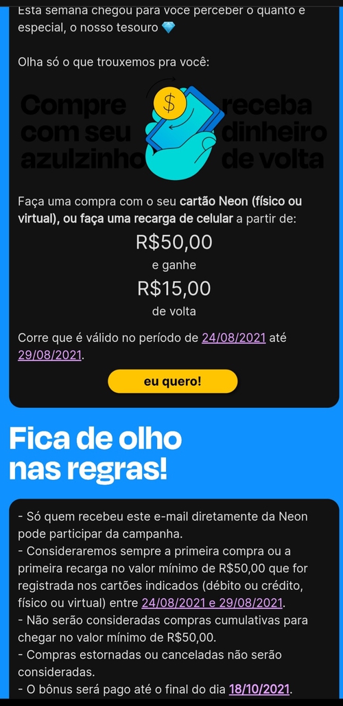 (SELECIONADOS) GASTE R$ 50,00 COM CARTÃO NEON E GANHE R$ 15,00 DE VOLTA