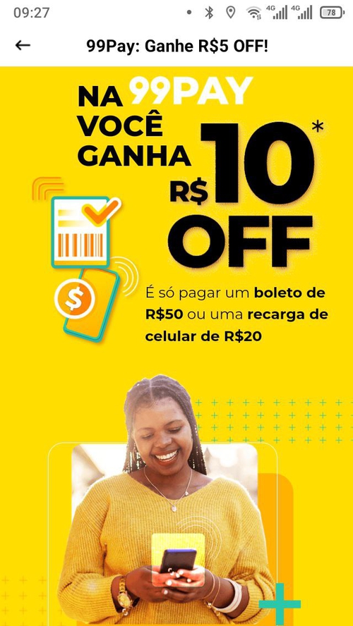 R$ 10,00 de desconto em pagamentos de boleto de R$ 50,00 ou mais, ou em recargas de celular de R$ 20,00 ou mais.