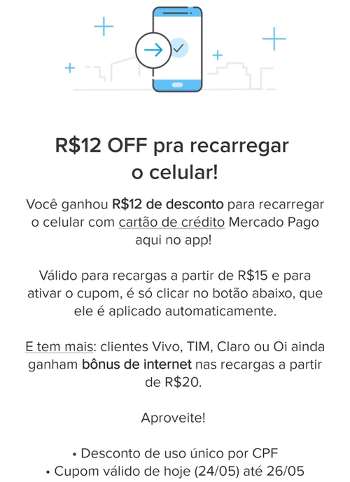 [Selecionados] R$12OFF em recargas partir de R$15 c/ cartão MercadoPago