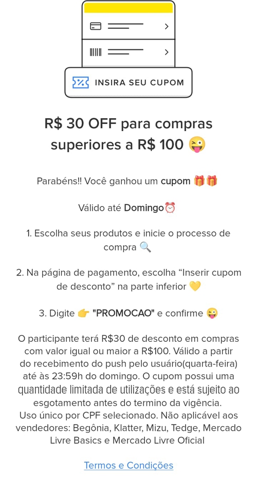 O participante terá R$30 de desconto em compras com valor igual ou maior a R$100. Válido a partir do recebimento do push pelo usuário(quarta-feira) até às 23:59h do domingo. O cupom possui uma quantidade limitada de utilizações e está sujeito ao esgotamento antes do termino da vigência. Uso único por CPF selecionado. Não aplicável aos vendedores: Begônia, Klatter, Mizu, Tedge, Mercado Livre Basics e Mercado Livre Oficial.