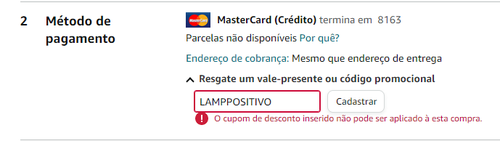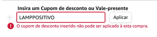 Aparece minha Alexa , tanto é que na página da lâmpada tem "Pode ser usado com sua Alexa" , mas quando insiro o cupom dá essa mensagem 🙄