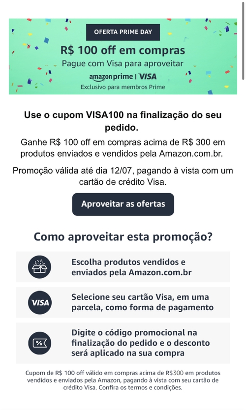 Só começa a valer a partir do dia 02 né? Sou prime desde que foi disponibilizado aqui no Brasil, mas não fui selecionada, na real nunca fui selecionada nesses cupons específicos, compro nessa desgraça todo mês kkkk Pior que mesmo que fosse, nem cartão Visa tenho