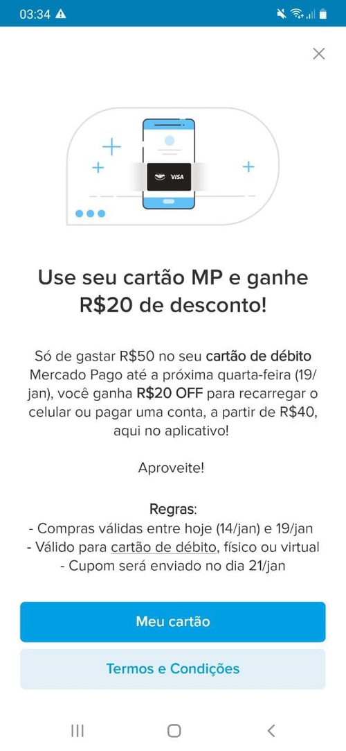 Campanha de desconto exclusiva para usuários impactados diretamente pela notificação realizada pelo app Mercado Pago. Válida para usuários que realizarem ao menos 1 compra com cartão de débito Mercado Pago Visa físico ou virtual no valor mínimo de R$ 50,00, ou um acúmulo de compras que soma seja igual ou superior à R$50,00 durante o período de 14/01/2022 à 19/01/2022. Estes receberão desconto de R$ 20,00 ao realizar um pagamento de conta ou recarga de celular no valor mínimo de R$40 via app do Mercado Pago. O referido desconto ficará disponível para o usuário elegível a partir do recebimento de uma notificação via app Mercado Pago e o desconto poderá ser utilizado durante o período de 21/01/2022 a 23/01/2022 uma única vez. Desconto aplicável para pagamento de contas consumo ou tributos (IPTU, IPVA, DAS, água, luz, telefone, etc), pelo app Mercado Pago ou para recargas de qualquer operadora disponível no app. O desconto não é válido para o pagamento de faturas bancárias de outras contas digitais. Os descontos são pessoais e intransferíveis. O participante em nenhum caso poderá solicitar a conversão dos descontos em moeda em espécie. O Mercado Pago não garante o acesso e uso continuado ou ininterrupto da plataforma e dos serviços de pagamento. O sistema pode eventualmente não estar disponível devido a dificuldades técnicas ou falhas de Internet, interrupção ou queda do sistema, nos links ou ferramentas de pagamentos ou por qualquer outra circunstância alheia ao Mercado Pago ou a seus parceiros comerciais. Os clientes não poderão responsabilizar o Mercado Pago, ou exigir ressarcimento algum, em virtude de prejuízos resultantes das dificuldades mencionadas, assim como por qualquer outro tipo de dano oriundo do disposto nesta cláusula. O Mercado Pago se reserva ao direito de, a qualquer momento, alterar ou encerrar antecipadamente a campanha de Descontos Promocionais, atualizando ou retirando de circulação sua respectiva divulgação. Ainda, este Regulamento poderá ser alterado a absoluto e exclusivo critério do Mercado Pago. Caso qualquer cliente discorde das alterações realizadas, este terá o direito de deixar de participar da campanha de Desconto Promocional. Campanha válida apenas para usuários de Mercado Pago que receberem diretamente a comunicação via push, e-mail, ou dentro do app Mercado Pago. Fica, desde já, eleito o foro central da Comarca da Capital do Estado de São Paulo para solução de quaisquer questões referentes a este Regulamento