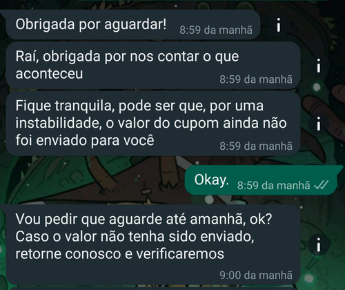 A mim ela não convenceu, se isso realmente acontece deveria constar nos termos e condições. Fora que a minha parte foi toda cumprida, o valor foi debitado. Se a plataforma tem conhecimento q algumas transações levam até 10 dias para serem concluídas, e estabeleceram um período anterior e muito limitado para receber e usar o cupom, acho q isso configura uma campanha feita com extrema má fé. Enfim, to considerando entrar na justiça visto q não foi a primeira vez q eles fizeram algo desse tipo comigo.