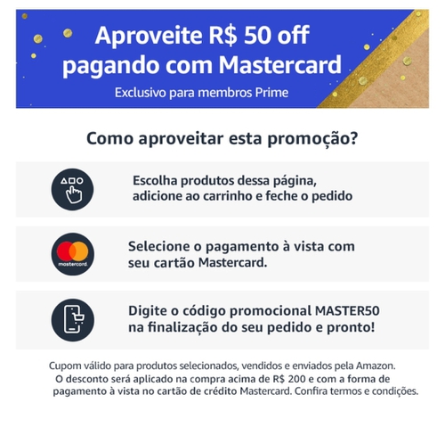 Cada código promocional poderá ser utilizado apenas uma vez por cliente e concederá um desconto não cumulativo de R$ 50,00 (cinquenta reais), em um único pedido. Oferta válida para pedidos a partir de R$200 (duzentos reais), excluindo custos de embalagem para presente, para pagamento à vista e com cartão de crédito Mastercard. Este código promocional é por tempo limitado, expirando às 23:59 (Brasília) do dia 11/10/2023, podendo ser revogada ou alterada a qualquer momento pela Amazon.com.br.