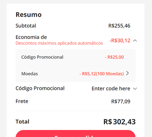O meu tá dando 77 de frete e sem os desconto de 20 a cada 100 :/