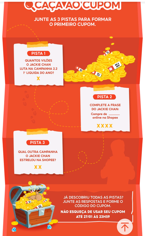 Shopee | Caça ao cupom - 26/01 a 28/01 - Até R$ 20 reais de cashback