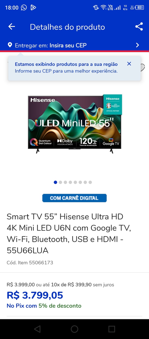 Smart TV 55” Hisense UHD 4K Mini LED U6N Google TV 2 anos garantia USB e HDMI - 55U66LUA