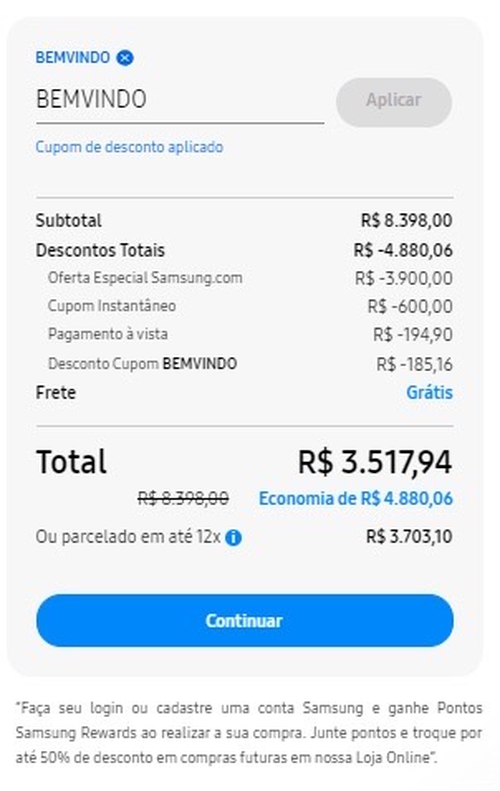 Antes de finalizar a compra, adicione o cupom BEMVINDO e o valor vai para R$3.517,94