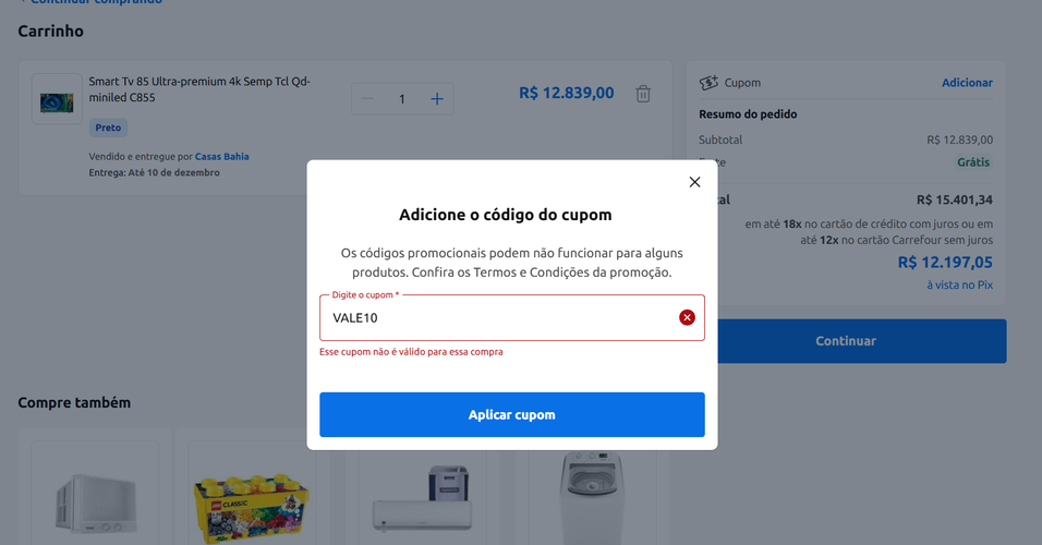 Cupom no pix . Cupom é meio chato de pegar só no pix , Vai no pagamento coloca o pix e depois volta no carrinho e aplica o cupom