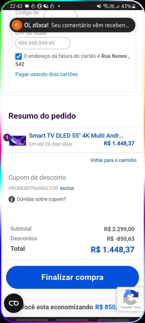 Deu mole cheguei a colocar carrinho deu o desconto demorei pra finalizar esgotou 🥲🥲