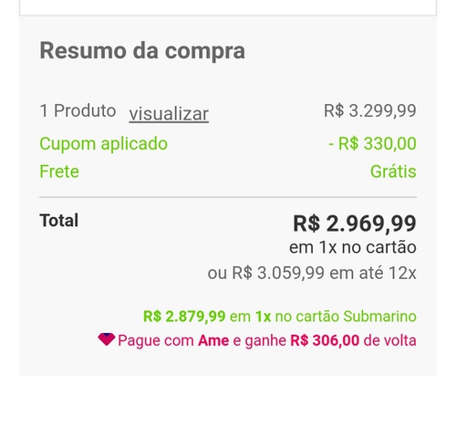 Mas preferi parcelar em 10X, saiu por 3059 - 300 de cashback = 2759