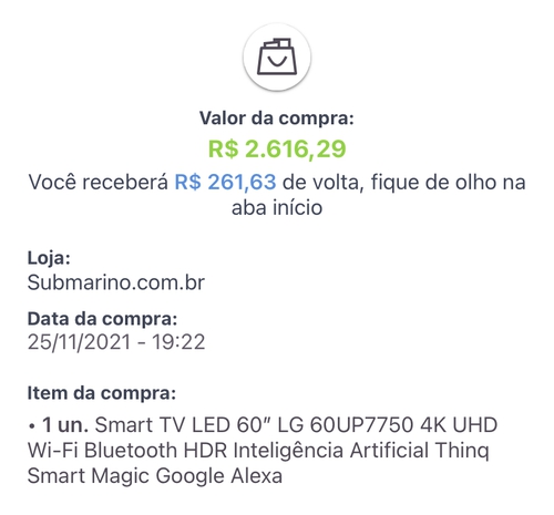 Olhem a print e a descrição galera, tem que usar o cartão submarino e cupom, e recebe 306 de cashback no ame.