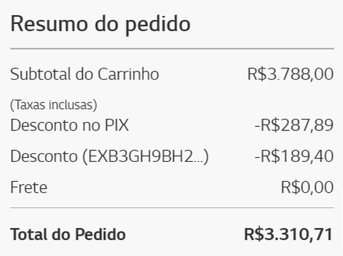 Para chega no valor basta criar uma conta no site da LG que você ganha um voucher de 5% que pode ser aplicado no carrinho como cupom