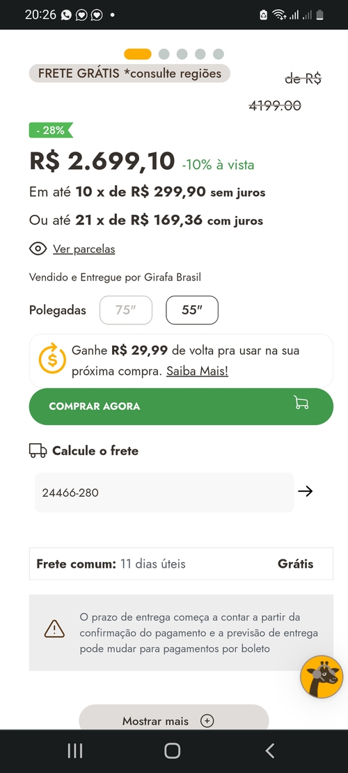 Lembrar que é a vista, boa prática informar isso na descrição. Valor a prazo é 2999, preço médio do mercado. Fora o frete que pra mim aqui deu alto mas varia de acordo com a região.