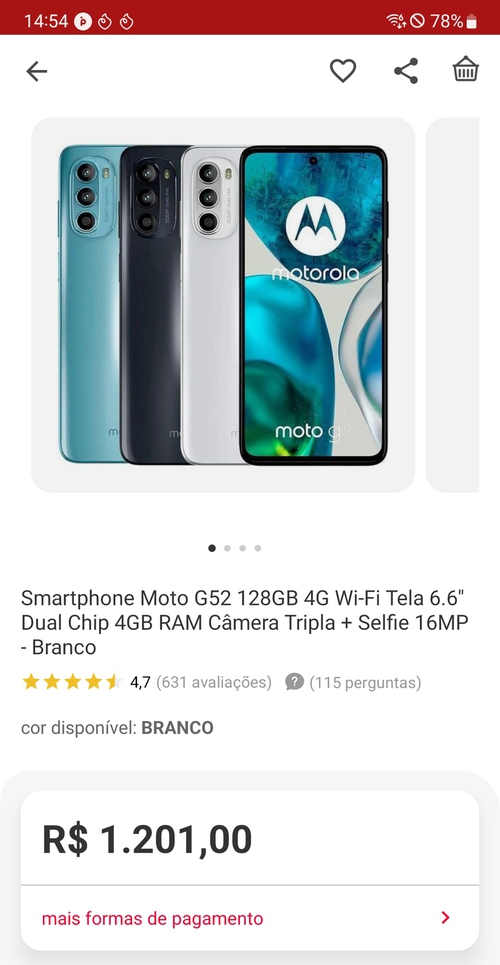 Smartphone Moto G52 128GB 4G Wi-Fi Tela 6.6'' Dual Chip 4GB RAM Câmera Tripla + Selfie 16MP - Branco