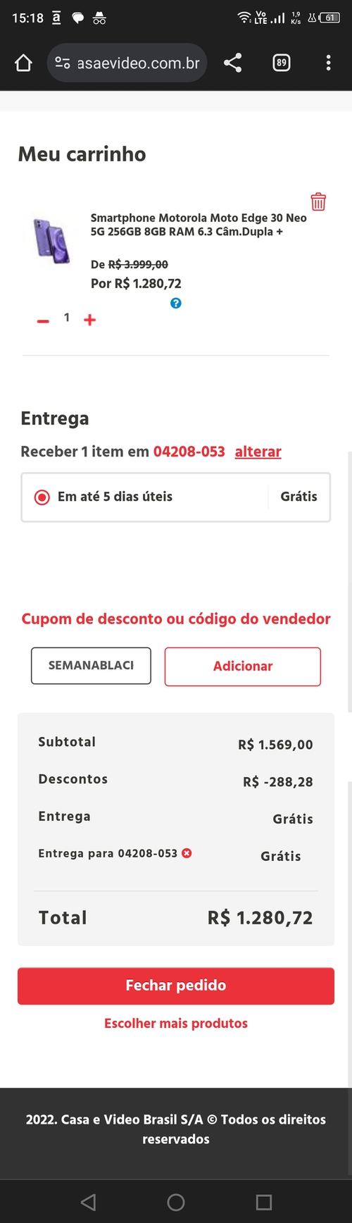 Smartphone Motorola Moto Edge 30 Neo 5G 256GB 8GB RAM 6.3 Câm.Dupla + Selfie 32MP - Very Peri 256GB
