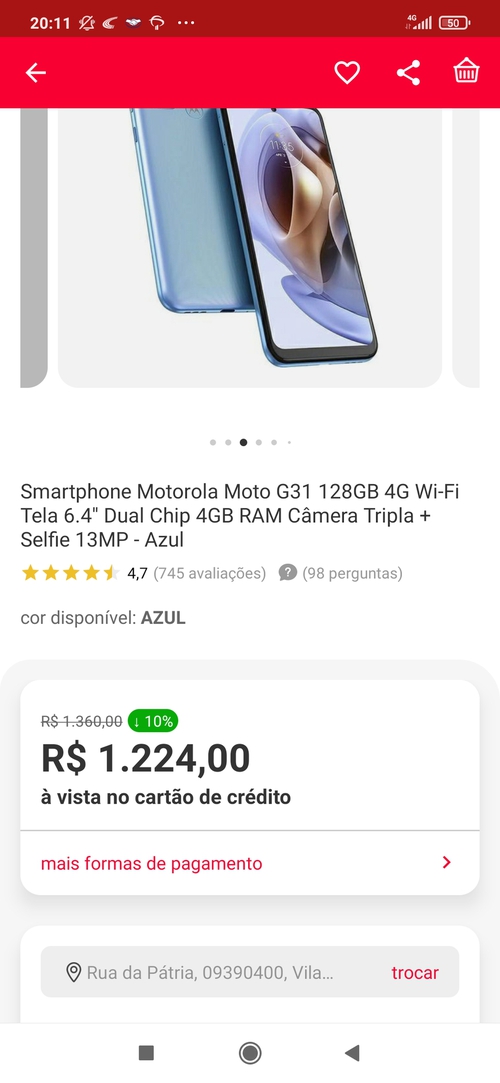 Smartphone Motorola Moto G31 128GB 4G Wi-Fi Tela 6.4'' Dual Chip 4GB RAM Câmera Tripla + Selfie 13MP - Azul