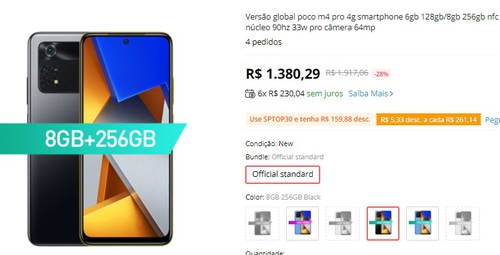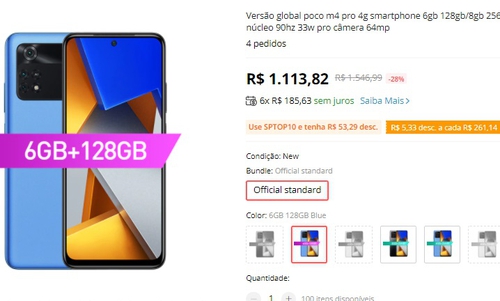 O primeiro quando escolhe a opção com 6GB de RAM e 128 GB de espaço interno o anuncio apresenta o codigo STOP10 ele da um desconto de R$53,29