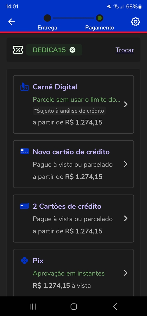 Fui fazer a compra ao finalizar aumentou pra 1400 no pix e coloquei o cupom ainda aà vcs me quebra né kkkkk