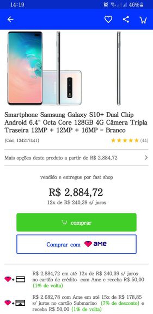 Smartphone Samsung Galaxy S10+ Dual Chip Android 6.4" Octa Core 128GB [cartão submarino + AME] R$2.633