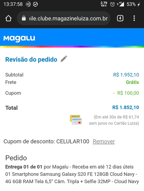 Cancelei o pedido que fiz ontem no Magalu e peguei aqui R$ 120,00 mais barato. https://www.shopfacil.com.br/smartphone-samsung-galaxy-s20-fe-128gb-cloud-navy---4g-6gb-ram-tela-65quot-cam-tripla--selfie-32mp-1172401433/p