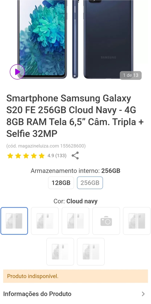 Smartphone Samsung Galaxy S20 FE 256GB Cloud Navy - 4G 8GB RAM Tela 6,5” Câm. Tripla + Selfie 32MP