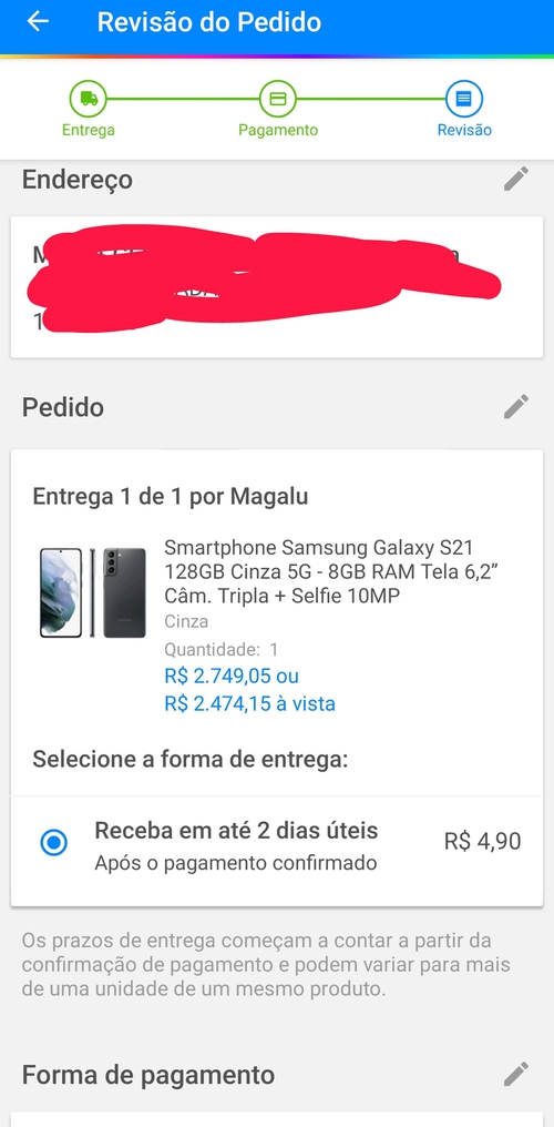 Tutorial brasileiro sofredor, etapas e requisitos para chegar no preço: clicar na notificação do dia das mães "DESCONTÃO", ser cliente ouro, usar o cupom ALO100 e pagar com magalu pay. Caso queira pagar no boleto o preço sobe para: R$ 2.474, como está nós prints.