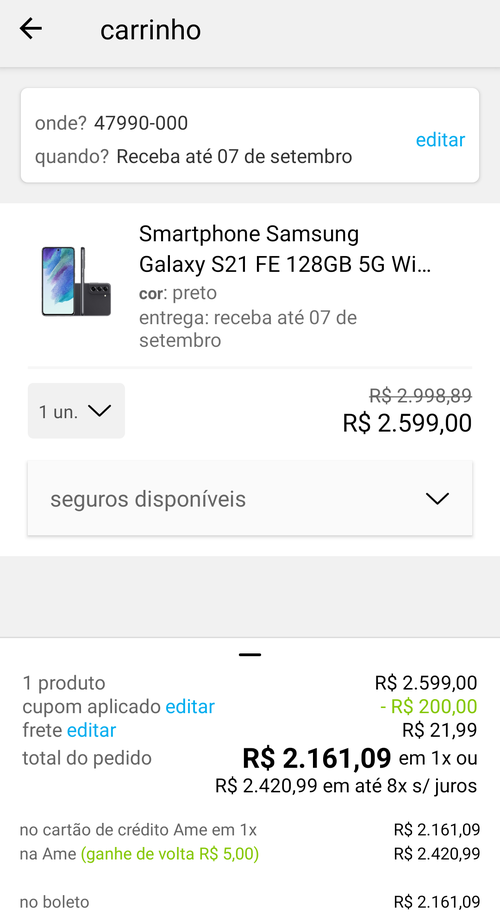 Ainda bem que peguei s21 por 1900 nunca mais voltou ,mesmo sendo cashback ame compensou.