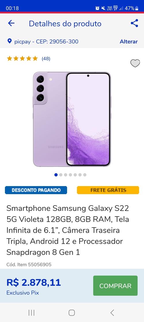 Smartphone Samsung Galaxy S22 5G Violeta 128GB, 8GB RAM, Tela Infinita de 6.1”, Câmera Traseira Tripla, Android 12 e Processador Snapdragon 8 Gen 1