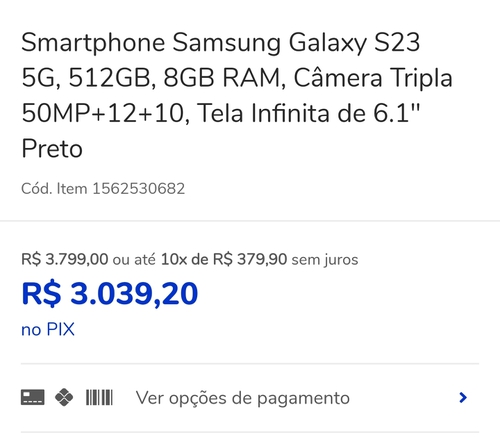 Smartphone Samsung Galaxy S23 5G, 512GB, 8GB RAM, Câmera Tripla 50MP+12+10, Tela Infinita de 6.1"