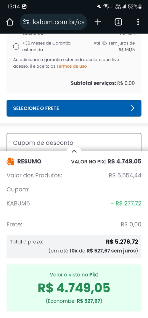Aqui deu erro ao abrir a página do Kabum