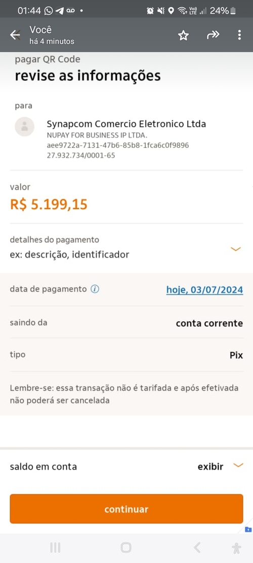 Rapaz, na hora de fazer o Pix apareceu o nome de Synapcom, alguma coisa. Fiquei com receio. É isso mesmo? Já comprei outros celulares na Samsung e aparecia o nome correto da empresa.