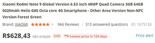 Smartphone Xiaomi Redmi Note 9 Global 3GB 64GB | R$628