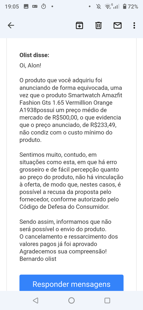 Ele cancelou o meu pedido e devolveu o dinheiro