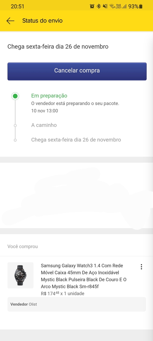 No rastreio do Olist aparece aquele genérico, mas no ML, o Watch3 ainda.